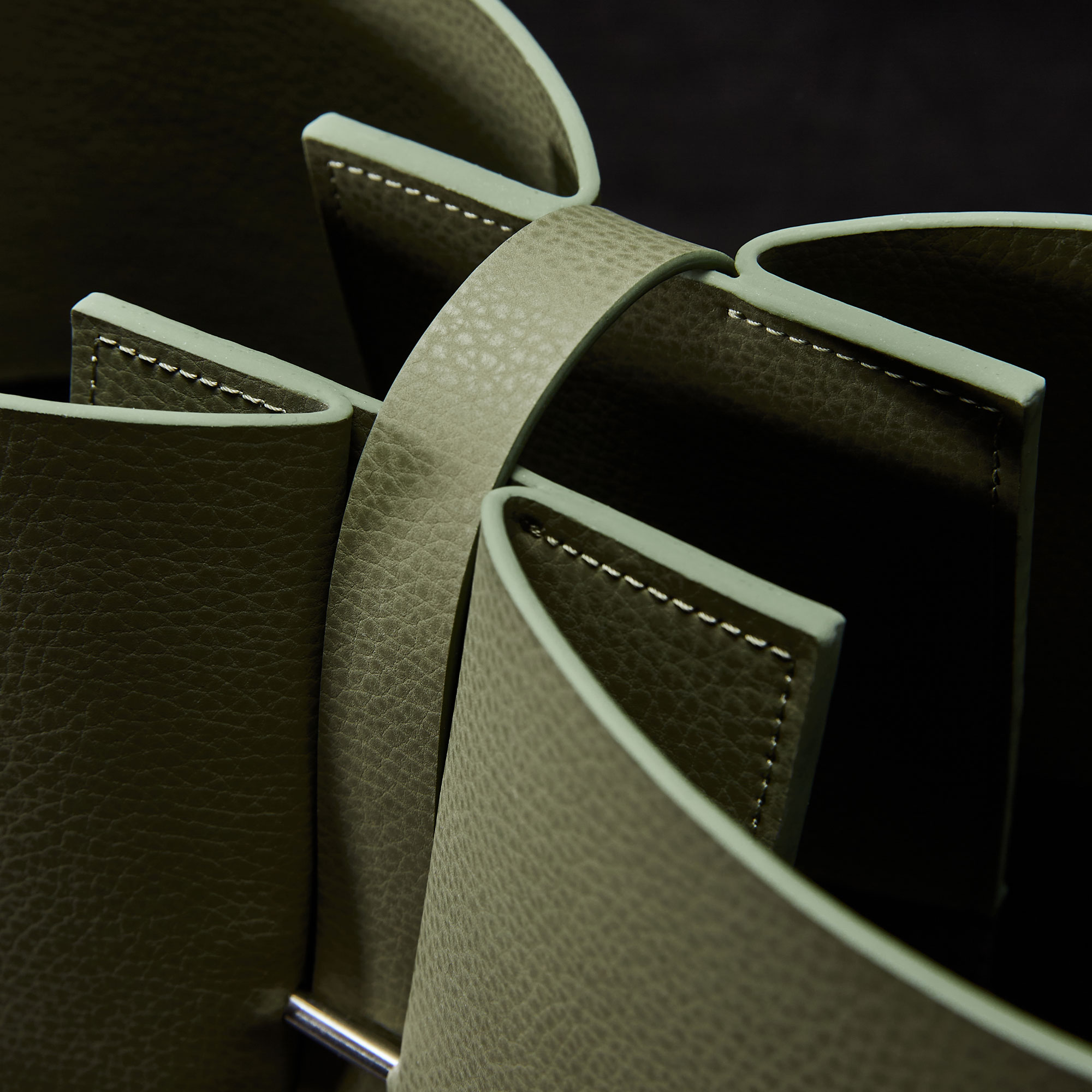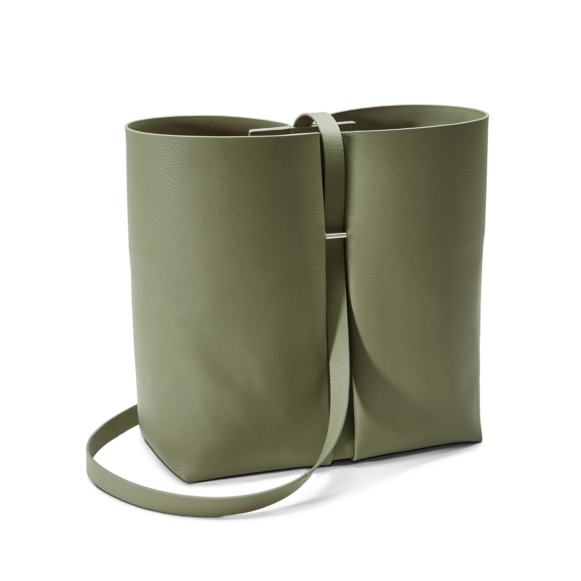 Cala ist eine elegante, offene Tasche mit großzügigem Volumen, die durch ihr außergewöhnliches Design sofort ins Auge fällt. Die architektonisch anmutende Silhouette ohne sichtbare Außennähte besticht durch das Wechselspiel von großen Flächen und weichen Radien. Eine raffinierte Faltung, die symmetrisch von der Vorder- zur Rückseite verläuft, trägt das für burggrafburggraf-Taschen typische Detail aus poliertem Edelstahl. Es dient als Ankerpunkt für den weichen, breiten Trageriemen, der einen geschlossenen Kreis bildet und so individuelle Tragevarianten mit kurzem oder langem Henkel ermöglicht. Im Inneren befindet sich eine Schlaufe zur Befestigung eines Schlüsselbundes.