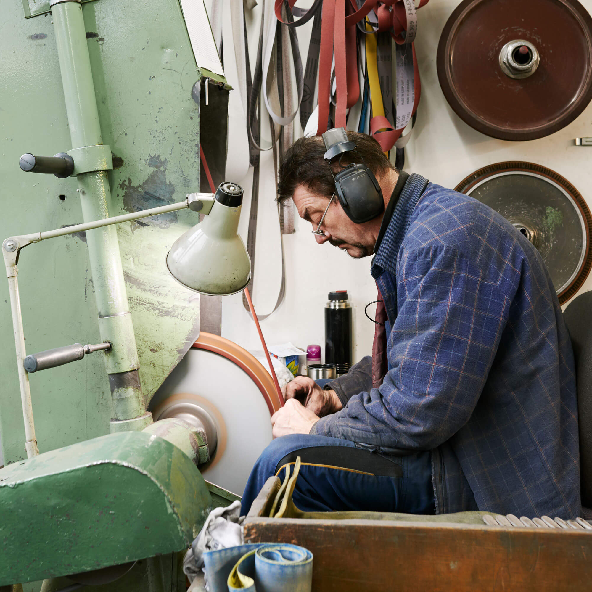 Dies ist der Ort, an dem seit 1959 Designgeschichte geschrieben wird. Auf rund 2000 Quadratmetern befinden sich Produktion, Schleiferei, Lager, Konfektion, Versand, sowie Administrations- und Vertriebsbüro. Einiges hat sich hier verändert, vieles ist aber auch gleich geblieben. Große Teile von Warenwirtschaft, Vertrieb und Kommunikation haben sich digitalisiert, LED Leuchten erhellen die Produktionshalle und Mitarbeiter kommen mit E-Bikes zur Arbeit. Gleichzeitig wird mit sturer Überzeugung an traditionellen Herstellungsverfahren festgehalten im Glauben, dass handwerkliches Geschick, das menschliche Auge und hochwertige Materialien tatsächlich einen Unterschied machen.