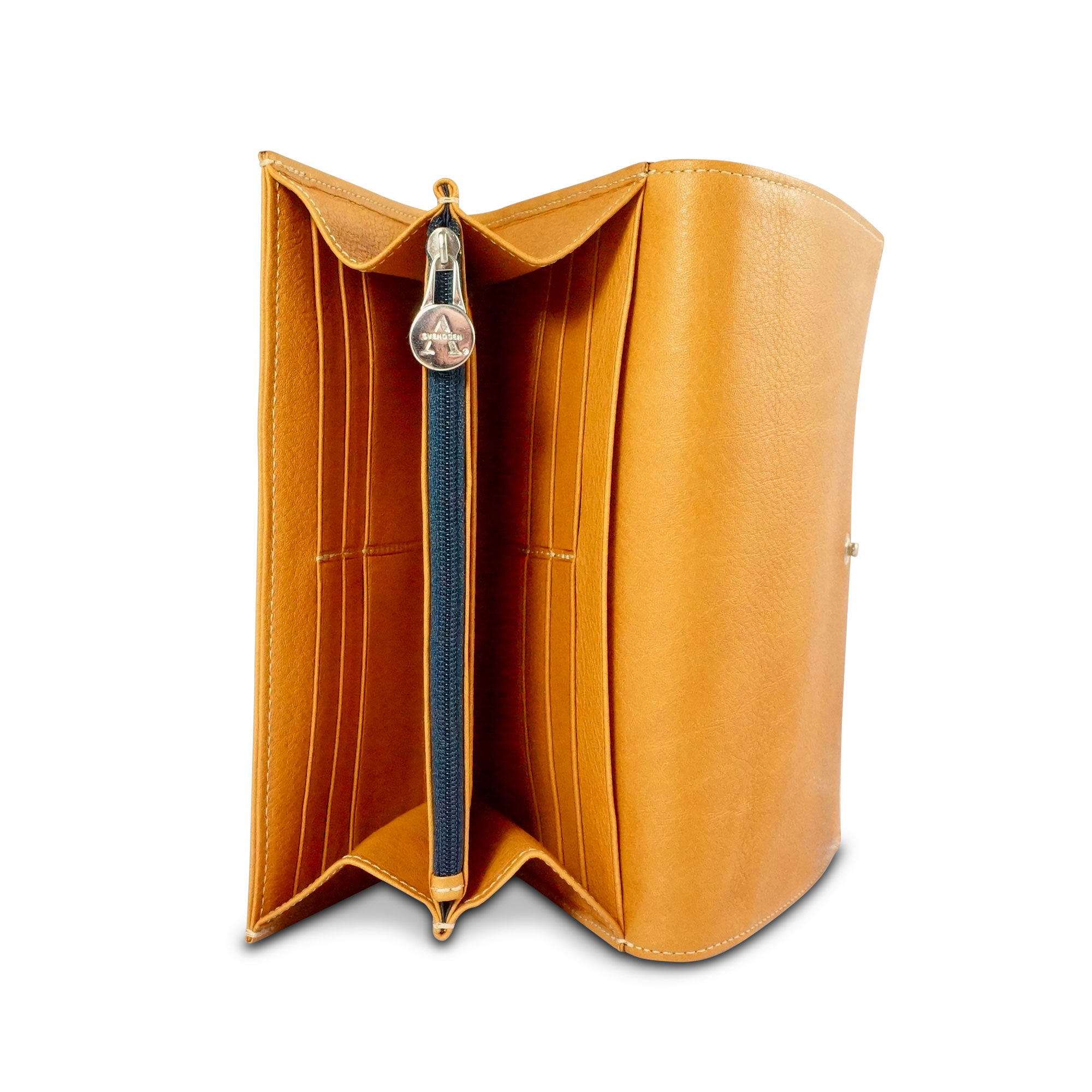 Das cognacbraune Maxi-Portemonnaie aus weichem, mehrfach zertifiziertem Natur-Rinderleder (Zertifikate: IVN, ECARF) bietet viel Platz für die unentbehrlichen Begleiter des Alltags. Es passt sowohl in die ALEXANDRA SVENDSEN Hobo-Bags als auch in die Umhängetaschen.