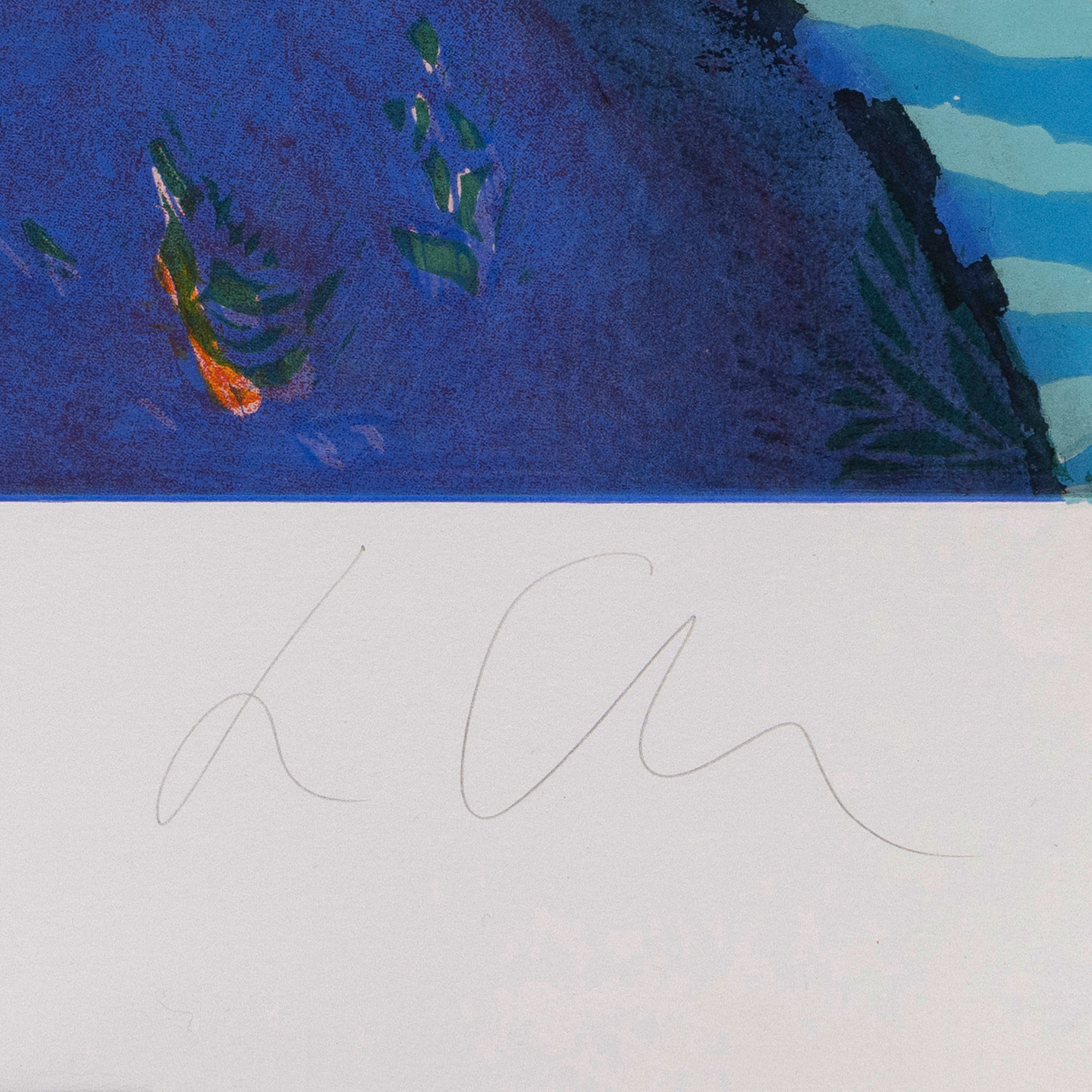 Die Farbradierung Scena d’Affetto (Szene der Zuneigung) des italienischen Stars der Transavanguardia, Sandro Chia, wurde 1987 in einer Auflage von 75 Exemplaren gedruckt. Sie zeigt ein Paar mit aneinander geneigten Köpfen, im Vordergrund links und rechts umfangen von den Zweigen eines Baumes, dessen Blätter die beiden Köpfe umspielen. Der Hintergrund gibt in horizontalen, stilisierten Linien ein Gewässer und am oberen Bildrand das Ufer wieder. Die Gesichter beider Figuren nach klassischem Schema haben einen träumerischen Ausdruck, ihre Blicke sind versunken oder in die Ferne gerichtet. Vorder- und Hintergrund lassen sie in einem geschlossenen Raum erscheinen, das Paar ist ganz für sich und bei sich. Chia schafft es meisterlich, mit wenigen Bildmitteln eine Atmosphäre der Vertrautheit, der Zuneigung und Stille zu erzeugen; die intensive Farbigkeit der Rot- und Blautöne vermittelt die Kraft ihrer Liebe und die starken Gefühle, die das Paar zueinander hegt.