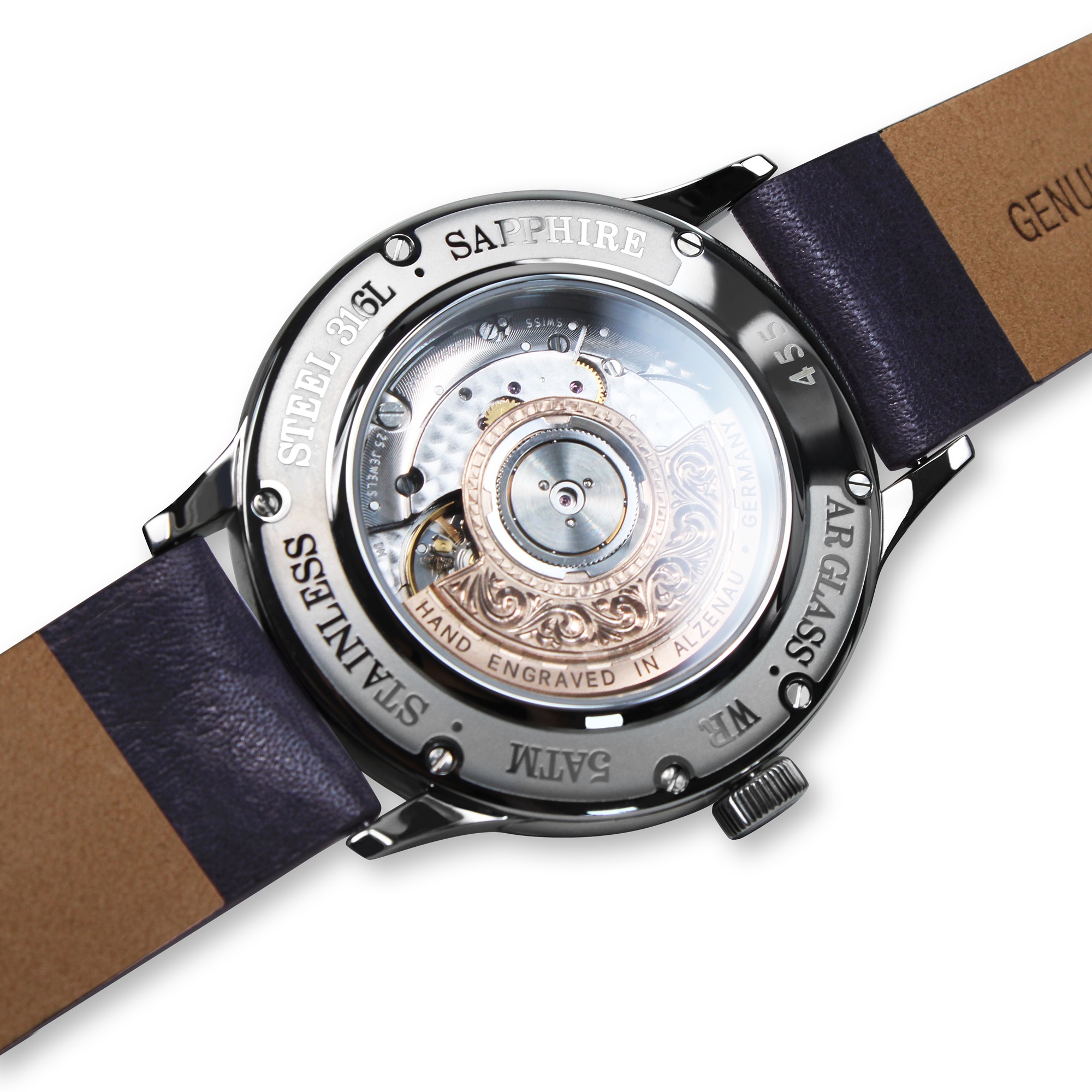 Die silberfarbenen Zifferblatt-Indexe 20, 40 und 60 werden in einem komplizierten Verfahren, das den gewölbten Teil des Zifferblattes ausgleicht, hergestellt. Damit bekommt die Uhr ein edles Erscheinungsbild. Das großflächige Zifferblatt vermittelt das Gefühl, dass die Uhr viel größer ist als in Wirklichkeit. Das hat einen weiteren Vorteil: Sie kann mit 40 mm Durchmesser sowohl von Damen, als auch von Herren getragen werden. Der Rotor des Schweizer Werks SW300 wurde im speziellen “Alexander Shorokhoff”-Stil graviert und veredelt.